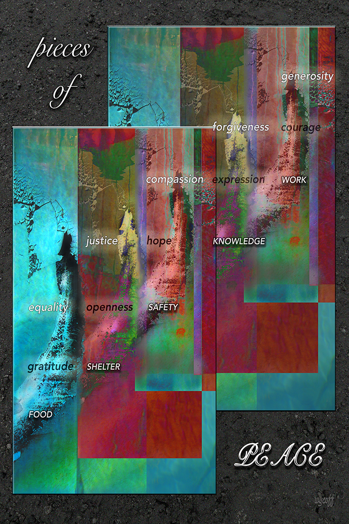 Obviously, I have no big answer, but I have a small answer that will help me sleep at night. And, it comes from a program Pacifica Graduate Institute created called Pondering Peace in a World of Turmoil. In response to their call for submissions, I submitted a piece of art titled: Pieces of Peace that incorporated three levels of words.
